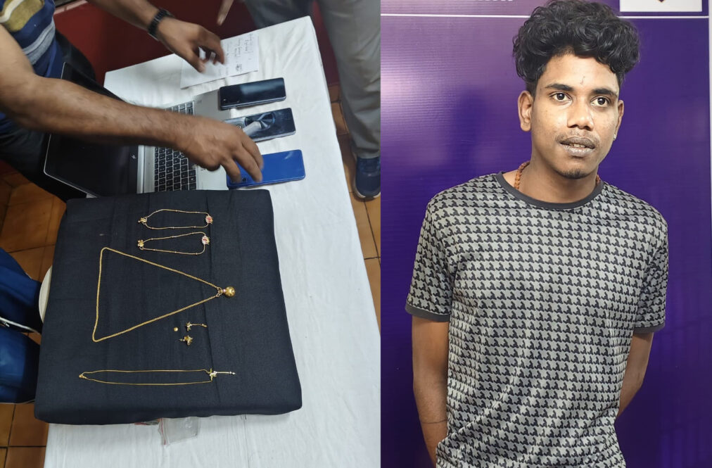 യുവാവില് നിന്നും മൊബൈല് ഫോണ്, സ്വര്ണം കൂടാതെ ലാപ് ടോപ്പ്, രണ്ട് മൊ ബൈല്ഫോണുകള് എന്നിവയും കണ്ടെത്തി.പ്രതിക്കെതിരെ മറ്റ് പലസ്ഥലങ്ങളിലായി ആറോളം കേസുകള് ഉള്ളതായും കോട്ടയം, പൂജപ്പുര എന്നീജയിലുകളില് ശിക്ഷ അനുവഭവിച്ചിട്ടുള്ളയാളാണെന്ന് പൊലിസ് പറയുന്നു.